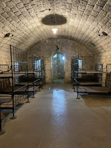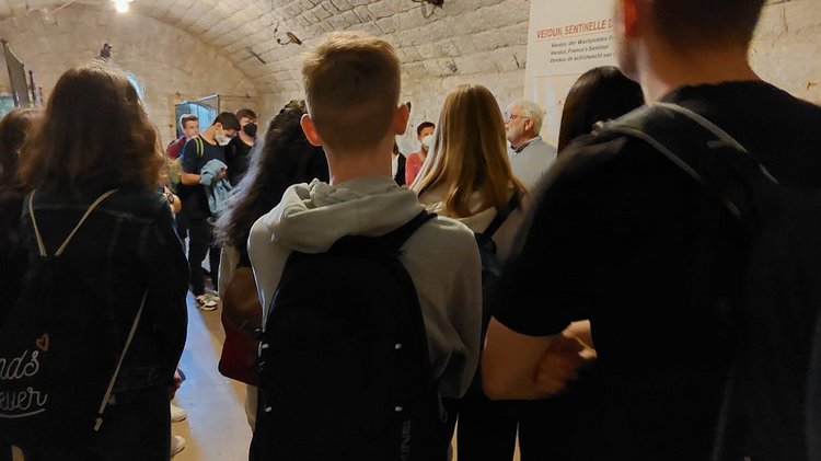 Die Schülerinnen und Schüler besichtigten zusammen mit ihren drei Begleitpersonen (Frau Charlier, Frau Beyen-Unte, Herr Walker) das Beinhaus mit angrenzendem Nationalfriedhof, außerdem das Fort Douaumont sowie das zerstörte Dörfchen Fleury, von dessen einstiger Existenz, bedingt durch die heftigen Bombardements, nur noch Grundmauern zeugen. Einen weiteren Höhepunkt bildete der Besuch des Mémorial, ein modernes Museum, das die historischen Ereignisse um den ehemaligen Schlachtort multimedial und damit anschaulich aufbereitet. Die informative und lebendig vorgetragene, mehrstündige Führung übernahm auch dieses Mal wieder das Ehepaar Hörter vom Volksbund Deutsche Kriegsgräberfürsorge e.V. (Bezirksverband Koblenz): Vielen herzlichen Dank für die tolle Begleitung!