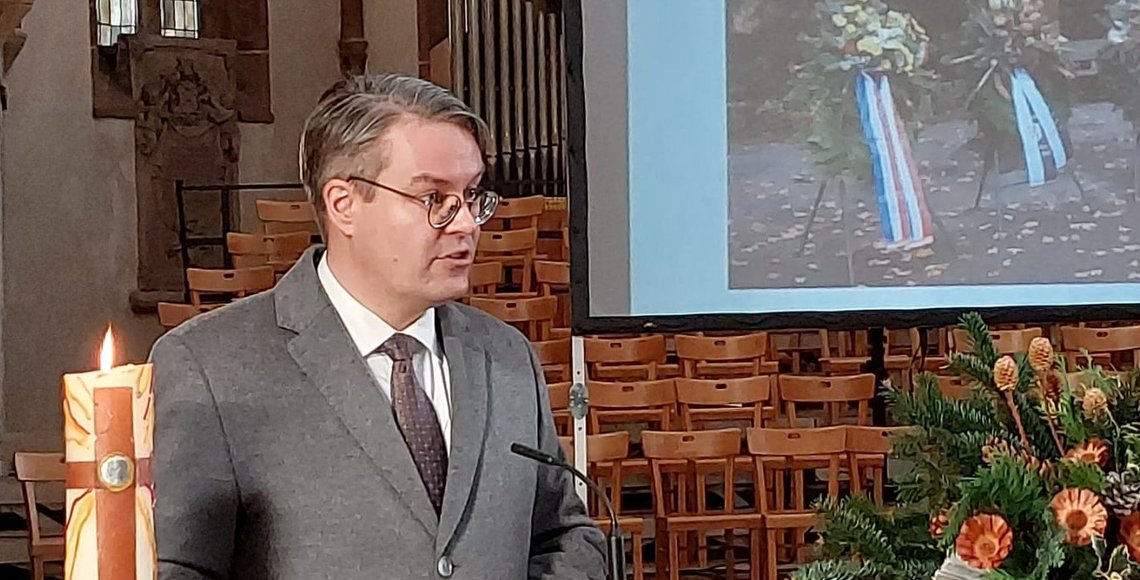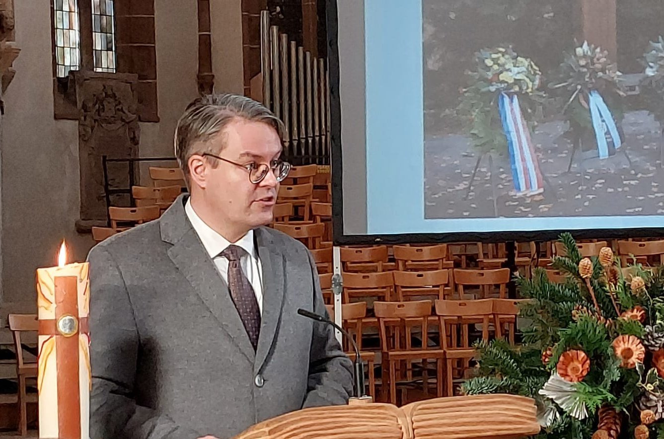 Am Volkstrauertag selbst konnte der Landesvorsitzende Martin Haller, MdL unter den rund 140 Gästen in der Landauer Stiftskirche Minister Alexander Schweitzer als Vertreter der Landesregierung begrüßen. Weitere Ehrengäste waren der Vize-Konsul der Republik Frankreich, Oberst Weber (Kommandeur Landeskommando Rheinland-Pfalz) sowie der Landauer Oberbürgermeister Hirsch. Die Gedenkrede hielt mit dem Staatsminister im Auswärtigen Amt Dr. Tobias Lindner, MdB, ein bekannter Lokalmatador, hat er doch seinen Wahlkreis in Landau. Er skizzierte die Linien der Erinnerungspolitik vor dem Hintergrund des Krieges in der Ukraine, der ja auch Auswirkungen auf die Kriegsgräberstätten des Volksbundes und auf die Arbeit des Volksbundes nicht nur in der Ukraine, sondern auch in Russland und in Weißrussland hat.
